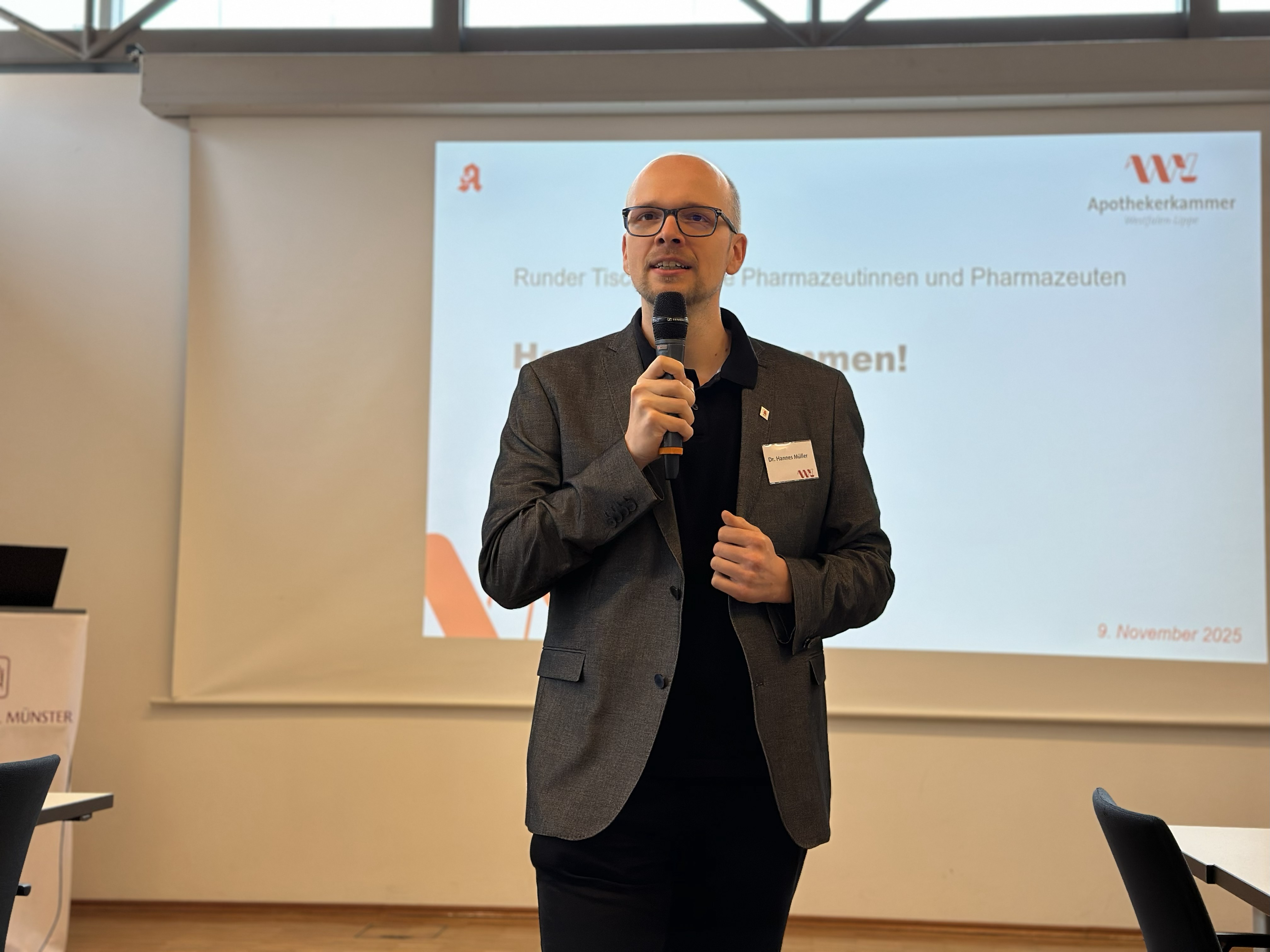 Im berufspolitischen Teil informierte Dr. Hannes Müller, Vorstandsmitglied der AKWL und der Bundesapothekerkammer, zum Zukunftspapier der ABDA und über den aktuellen Stand des geplanten Apothekenreformgesetzes. Das Apothekenreformgesetz ordnete Müller physikalisch ein: „Das Gesetz hat Licht und Schatten, wobei die Sonne leider enorm tief steht.“ Er appellierte an die Teilnehmenden, die laufenden politischen Prozesse aktiv zu begleiten und sich weiter klar zu positionieren: „Apotheken sind eine tragende Säule der wohnortnahen Versorgung – und diese Struktur braucht Apothekerinnen und Apotheker vor Ort. Das zeigen wir jeden Tag in den Apotheken und mit dieser Botschaft werden wir auch das Gesetzgebungsverfahren weiter begleiten.“