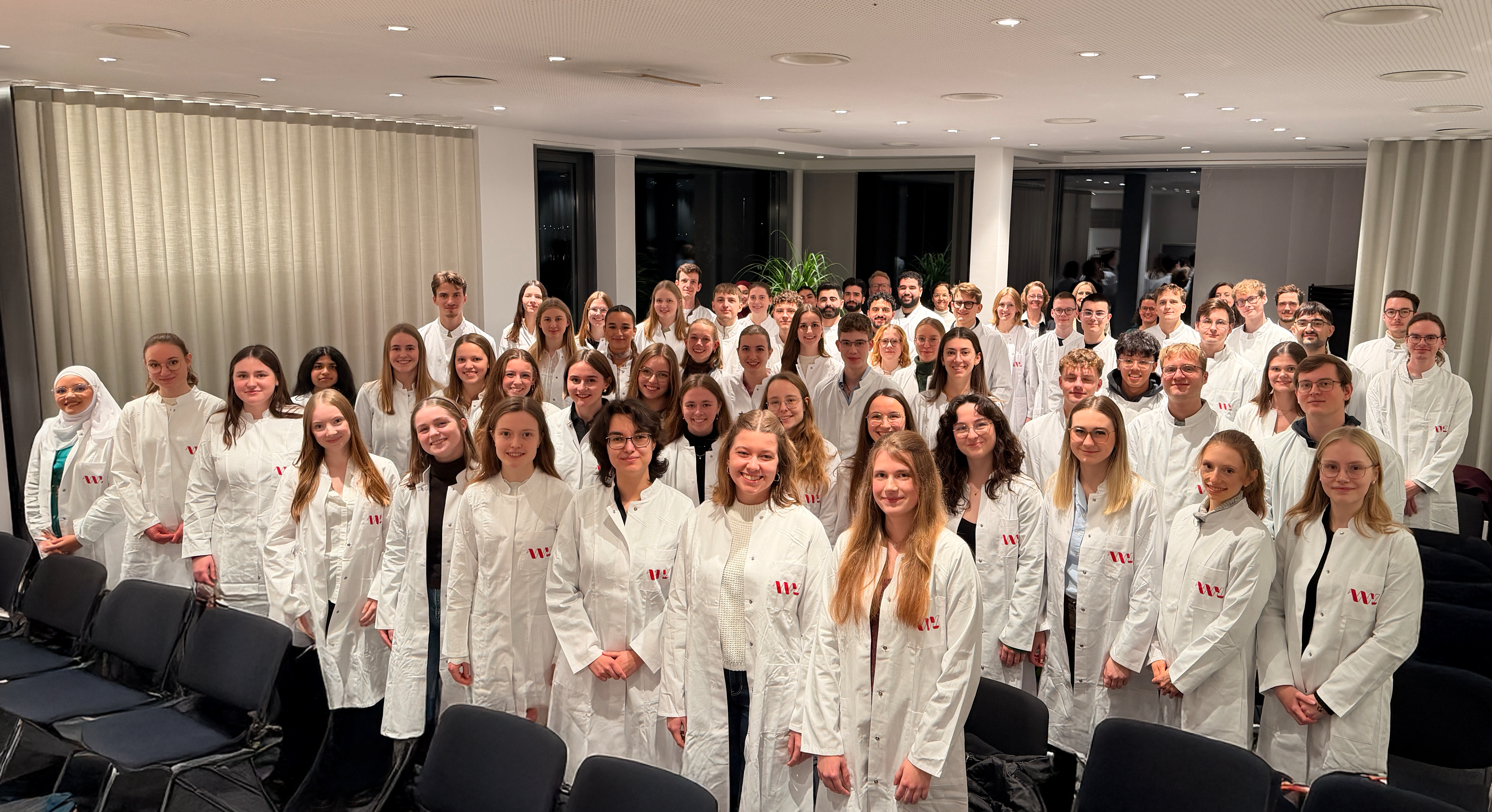62 Pharmazie-Studierende der Universität Münster haben am Mittwoch im Apothekerhaus ihre White-Coat-Ceremony gefeiert. Mit der Übergabe der weißen Kittel mit Kammerlogo markiert die Apothekerkammer Westfalen-Lippe traditionell den erfolgreichen Abschluss des ersten Staatsexamens und den Übergang vom Grund- ins Hauptstudium der Pharmazie.