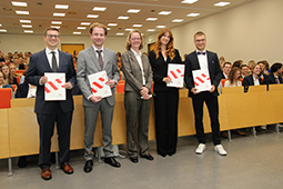 Münster, 30.10.2025. Mit exzellenten Prüfungsergebnissen hat Manuel Barenbrügge das Zweite Staatsexamen im Fach Pharmazie an der Universität Münster abgeschlossen. In allen fünf Prüfungsfächern erreichte er die Spitzennote „Sehr gut“ – eine Leistung, die nur in Ausnahmefällen gelingt. Für dieses herausragende Ergebnis erhielt Barenbrügge den Stiftungspreis der Apothekerstiftung Westfalen-Lippe.Im Rahmen der feierlichen Verabschiedung der 57 Pharmazie-Studierenden auf dem Pharma-Campus der Universität Münster gratulierte Sandra Potthast, Vorstandsmitglied der Apothekerkammer Westfalen-Lippe, dem Preisträger im Namen von Kammer und Stiftung und überreichte ihm neben der Urkunde einen Teilnahmegutschein für einen Pharmacon-Kongress der Bundesapothekerkammer – Reise- und Übernachtungskosten inklusive.In ihrem Grußwort würdigte Potthast den Einsatz und die Begeisterung der jungen Pharmazeutinnen und Pharmazeuten: „Dieser Enthusiasmus – dafür lohnt es sich, Apothekerin oder Apotheker zu werden.“Auch Ole Simon Brouwer, Linus Anton Rehder und Ellen Schmalz wurden für hervorragende Leistungen geehrt. Sie erreichten viermal „Sehr gut“ sowie einmal „Gut“ und erhielten dafür jeweils einen Teilnahmegutschein für den Westfälisch-lippischen Apothekertag, den alle zwei Jahre stattfindenden Fortbildungskongress der Apothekerkammer Westfalen-Lippe.